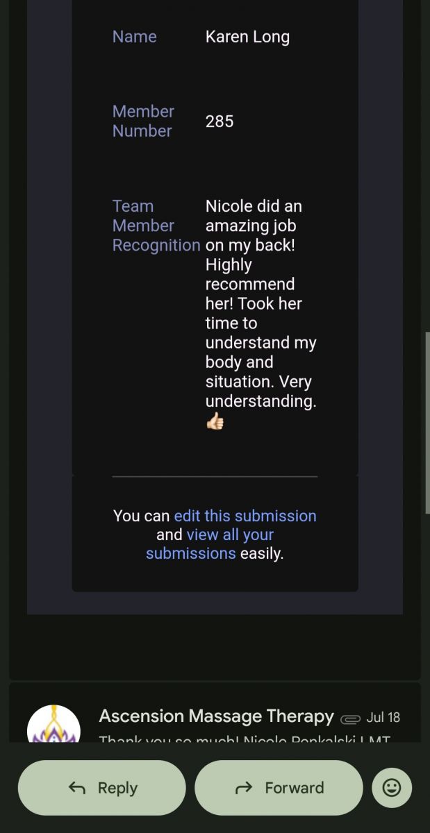 Nicole is awesome!!! I have been seeing her for almost 5 years and she is a very talented LMT!