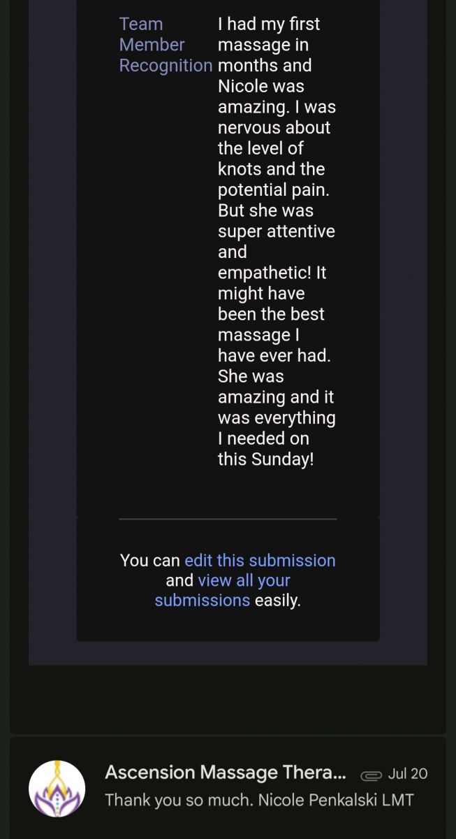 Elizabeth Schmidt reviewed Nicole Penkalski LMT — 5 star